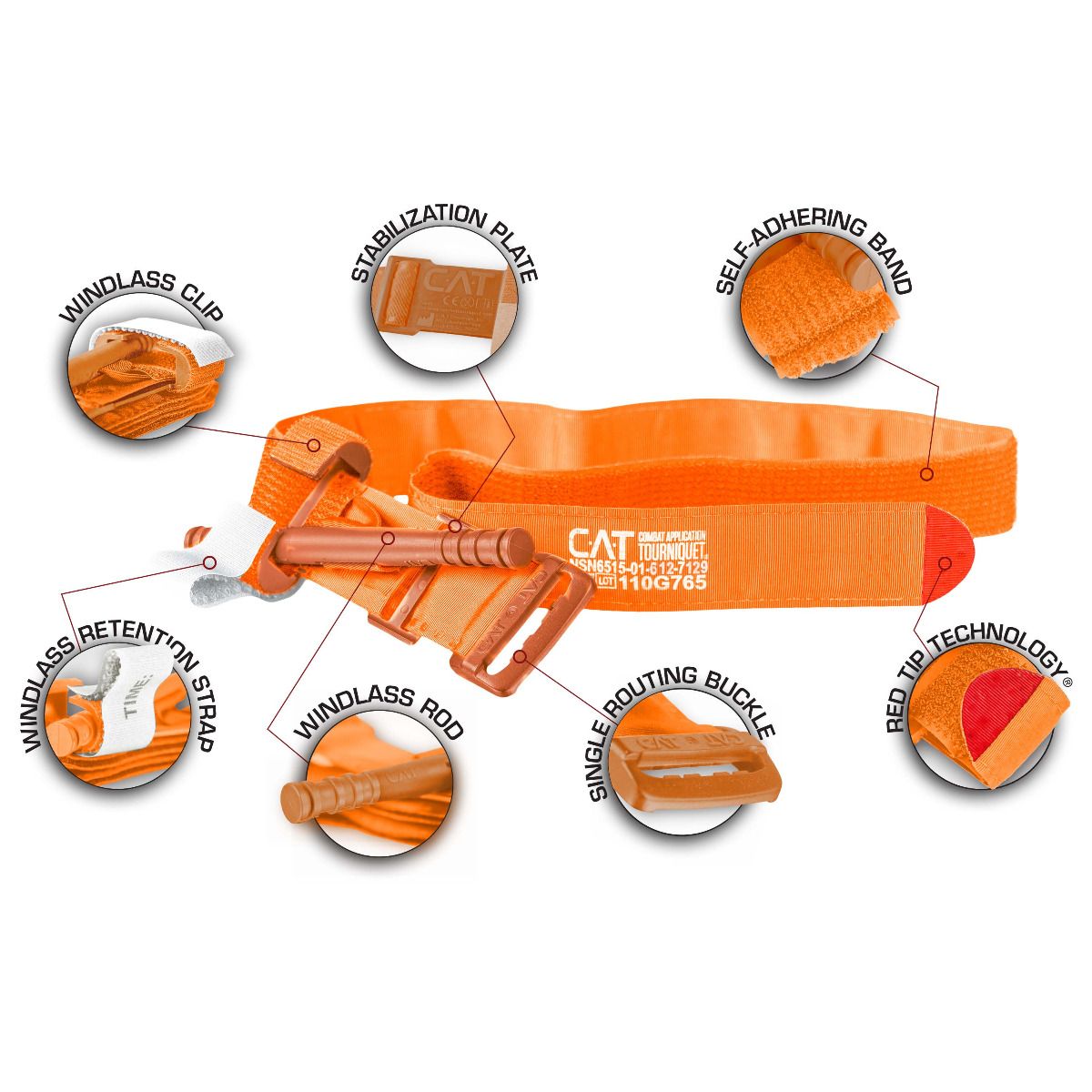 Noted as the best prehospital tourniquet in the February 2008 supplement of The Journal of Trauma The patented C-A-T® is a true one-handed tourniquet proven to be 100% effective by the U.S. Army’s Institute of Surgical Research. Tests proved that the CAT completely occluded blood flow of an extremity in the event of a traumatic wound with significant hemorrhage. The Gen 7 CAT utilizes a durable windlass system with a patented free-moving internal band providing true circumferential pressure to the extremity. Once adequately tightened, bleeding will cease and the windlass is locked into place. A hook and loop windlass retention strap is then applied, securing the windlass to maintain pressure during casualty evacuation. The patented Combat Application Tourniquet® (C-A-T®) featuring the proprietary red tip design and the mechanical advantage of a band within a band has been the Official Tourniquet of the U.S. Army since 2005. The innovations in the CAT are protected by U.S. Patent Nos. 7,842,067 and 7,892,253.